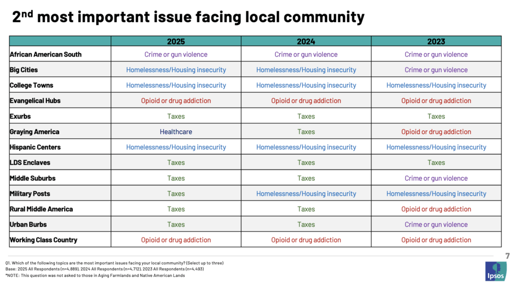 Meanwhile, taxes were the No. 2 community issue in 2025 for six community types of various sizes, geographies, education and income levels — Exurbs, LDS Enclaves, Middle Suburbs, Military Posts, Rural Middle America, and Urban Suburbs.
